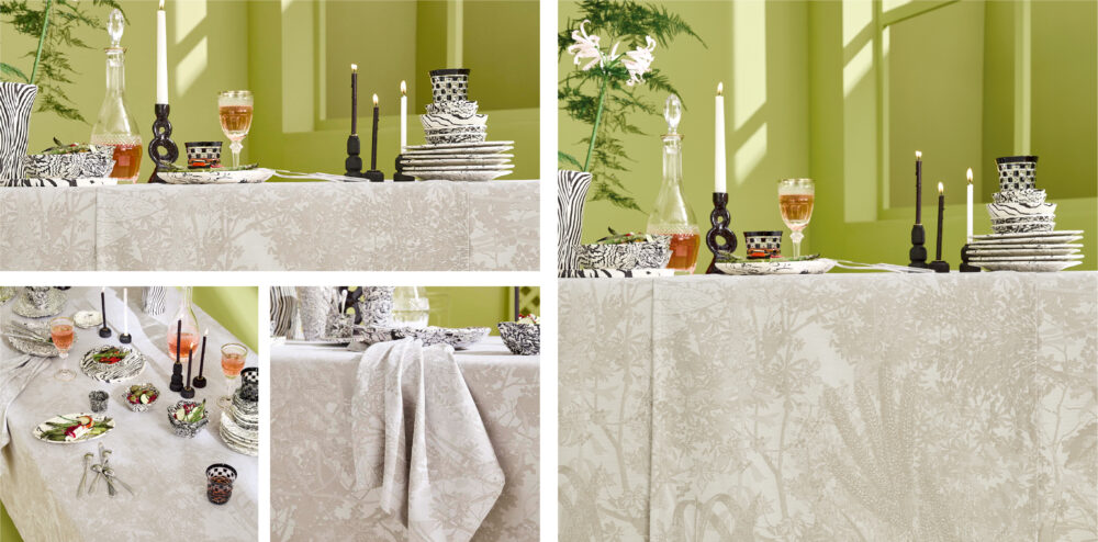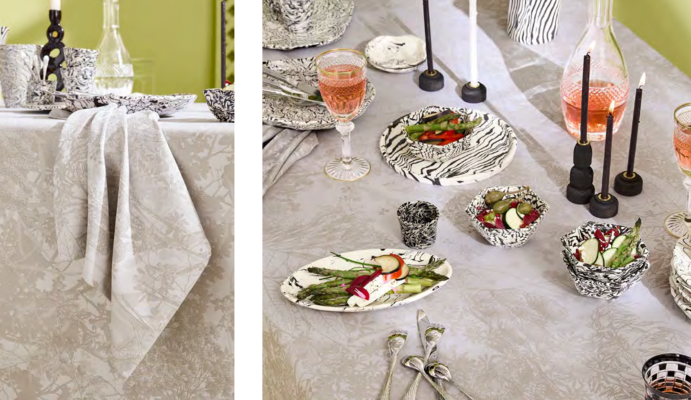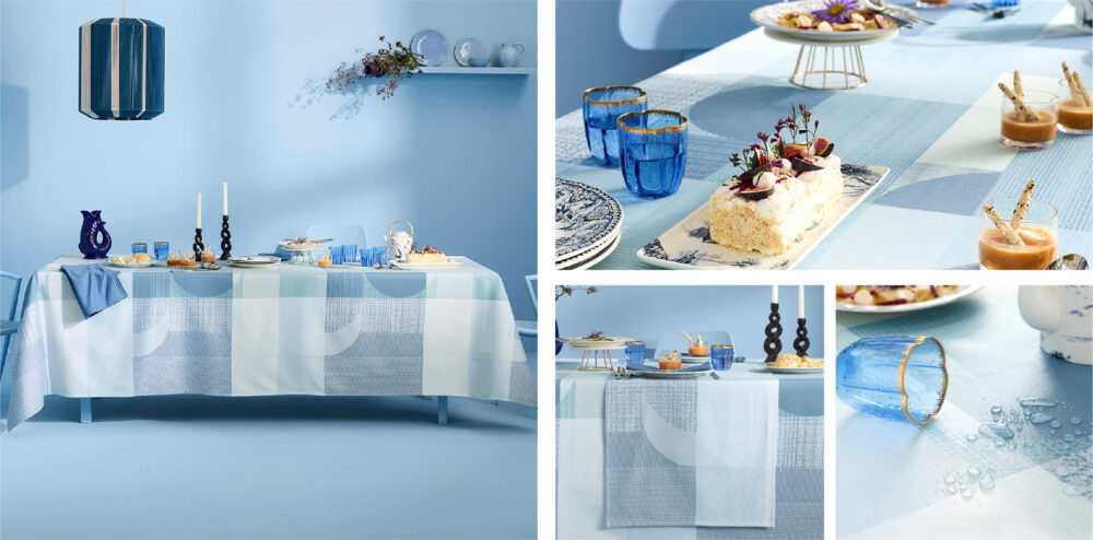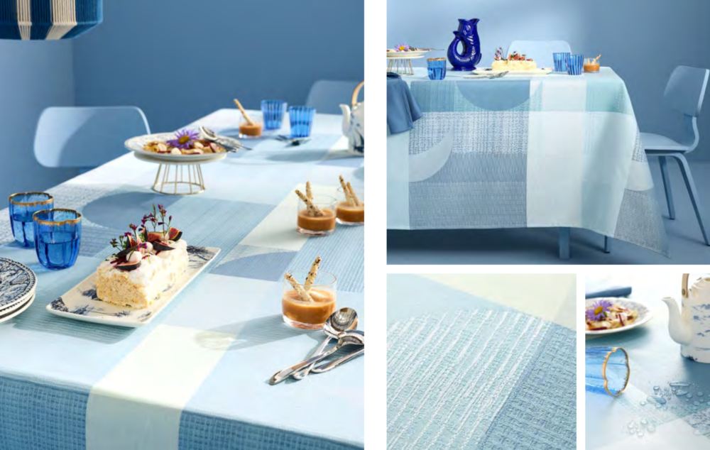 今季のテーマである水にちなんで、「波紋(remous)」や「流動(fluide)」を感じさせるデザインは、まるで穏やかな水辺で食事をしているかのような、清涼感と安らぎを与えてくれます。(撥水加工あり)