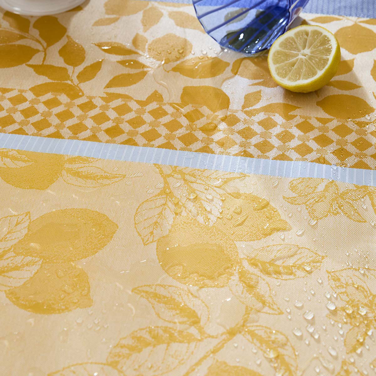 2026春夏新作。太陽とフレッシュさの象徴、レモンが主役。ジャカード織で表現されたレモンのストライプが、海辺の微風や南仏を思わせます。撥水加工付きで、お手入れが簡単です。