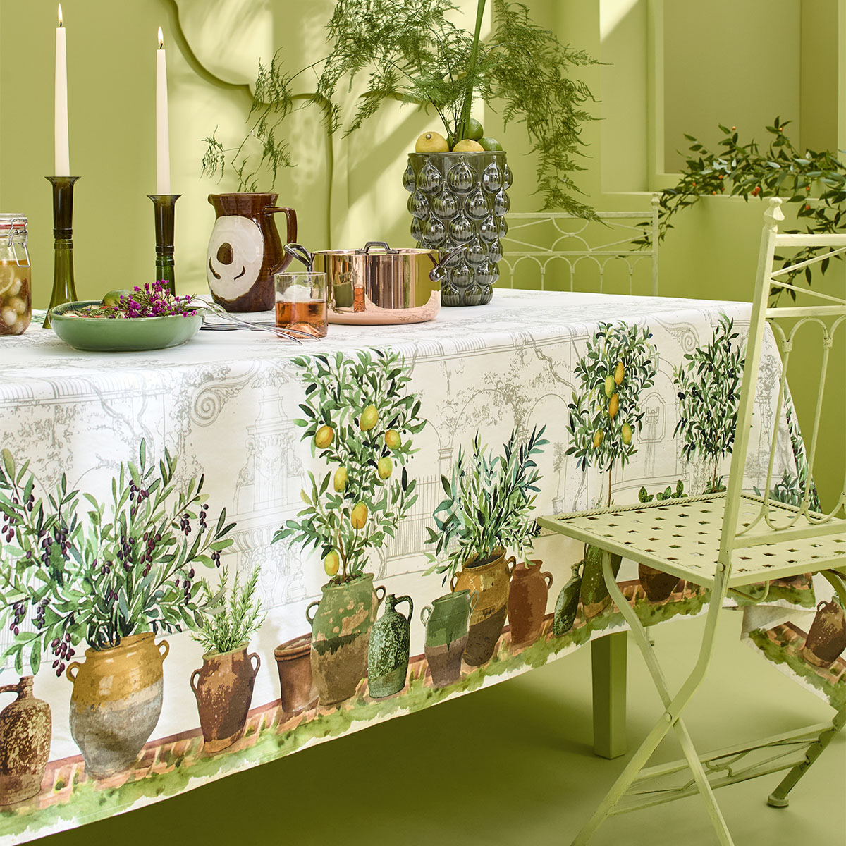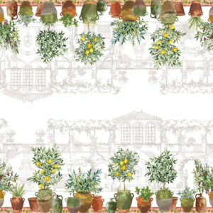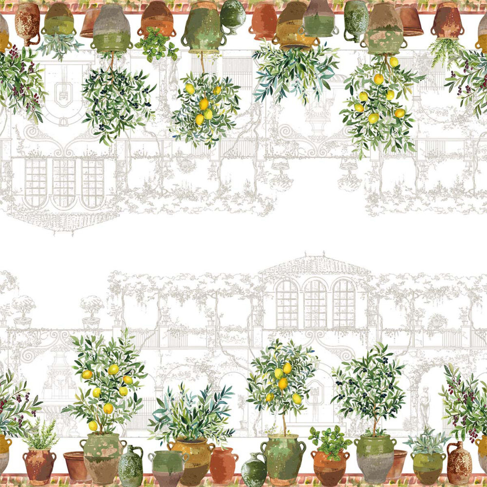 レモンやオリーブの鉢が並ぶ庭の情景は、歴史と自然が息づくフランス・プロヴァンス地方を彷彿とさせます。 お庭でのブランチにもぴったりな、風合い豊かな綿麻のクロス。大切な人とのリラックスした時間に、心地よいリズムを奏でます。