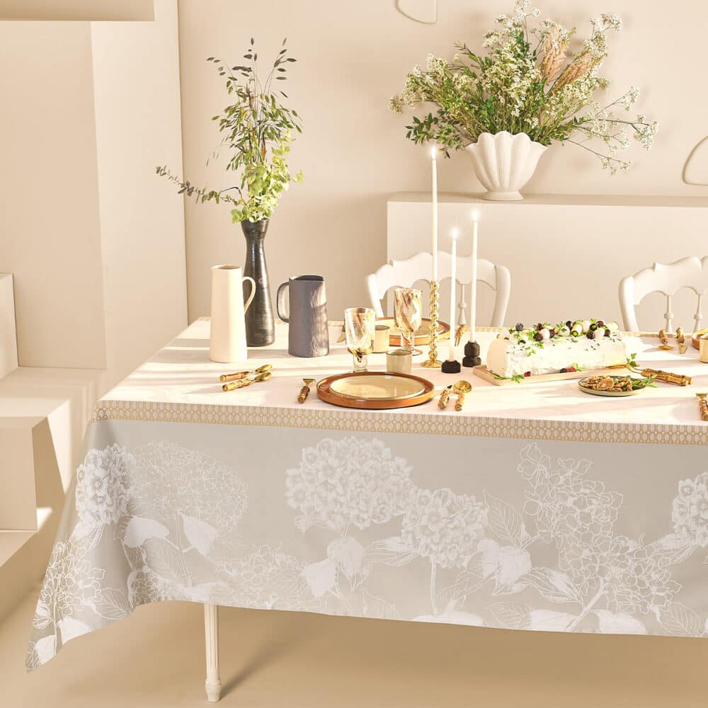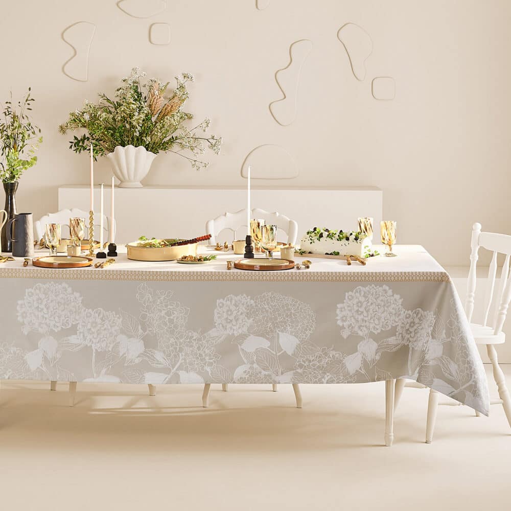 2025春夏新作「オルテンシア」が登場しました。ガルニエ・ティエボーで人気の高いアジサイ柄を、洗練された淡いクリーム色とグレーの色彩で織り上げました。大胆でありながらも繊細に描かれたアジサイが、食卓に優雅な華やぎを添え、特別なひとときを演出します。フランス製の最高級コットンを、熟練の職人が丁寧にジャカード織りで仕上げました。撥水加工を施し、機能性に優れています。飲み物や食べ物をこぼしても、サッと拭き取るだけでお手入れが簡単です。