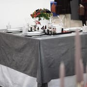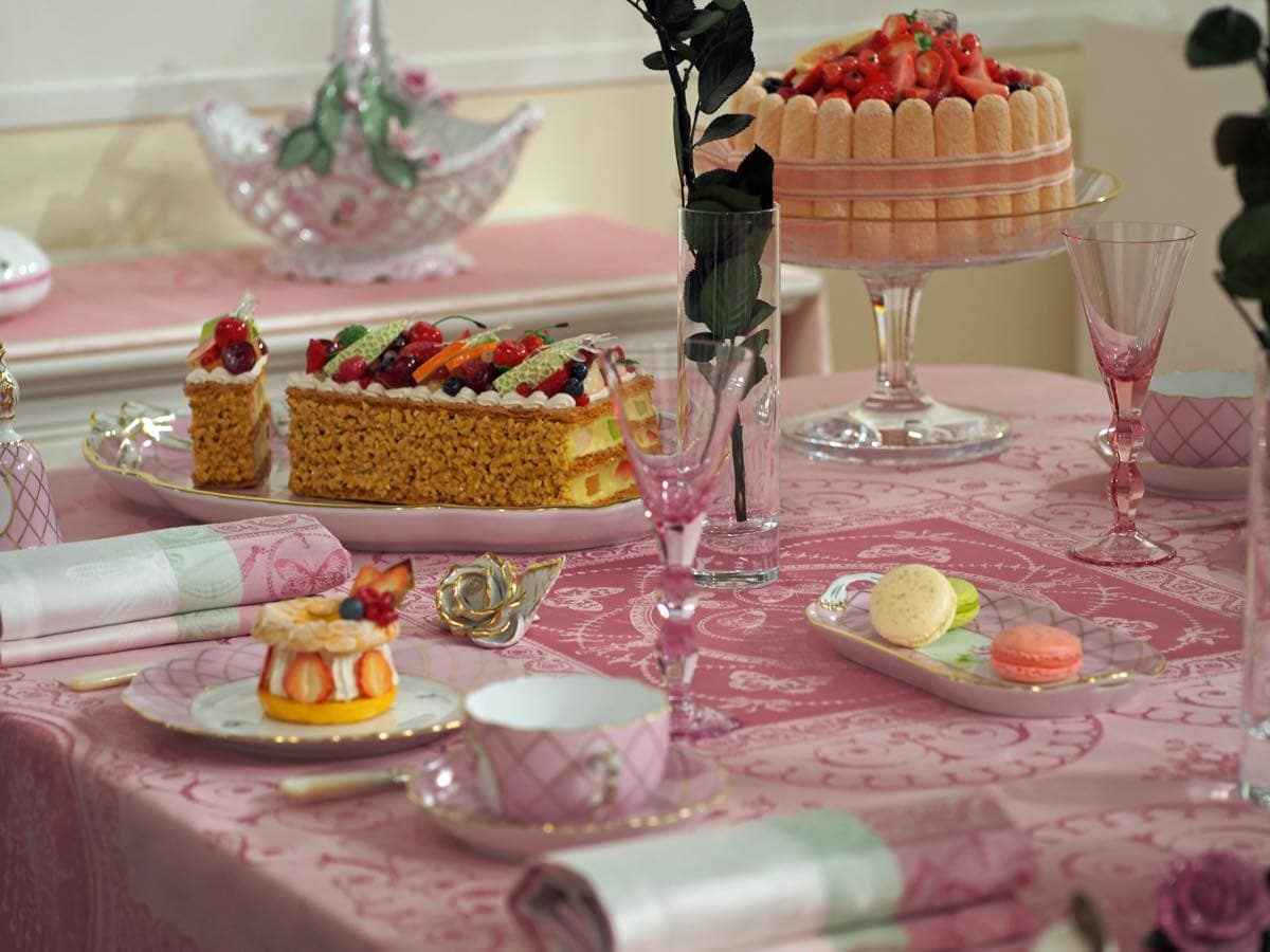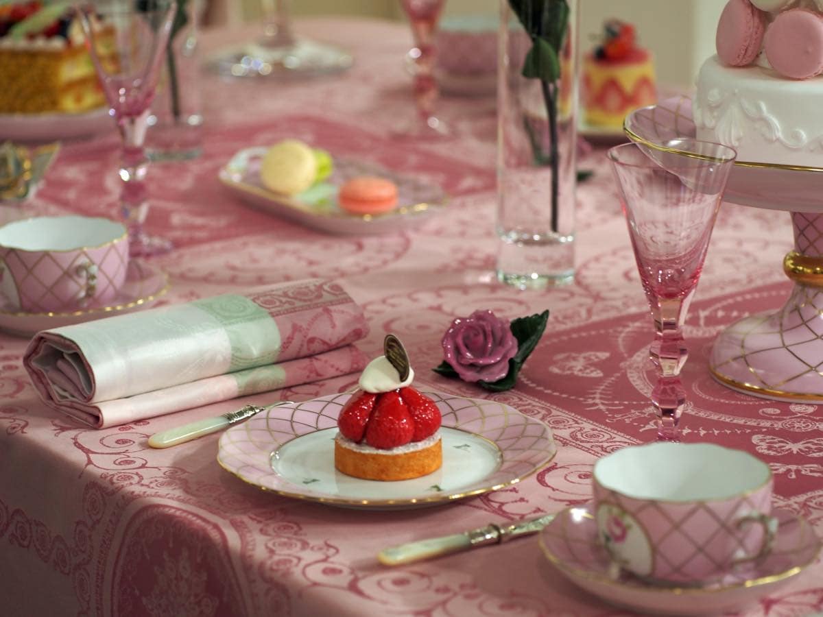 洋食器のヘレンドやエルキューイ・レイノーのブースでガルニエ・ティエボーのテーブルクロスが使用されました。